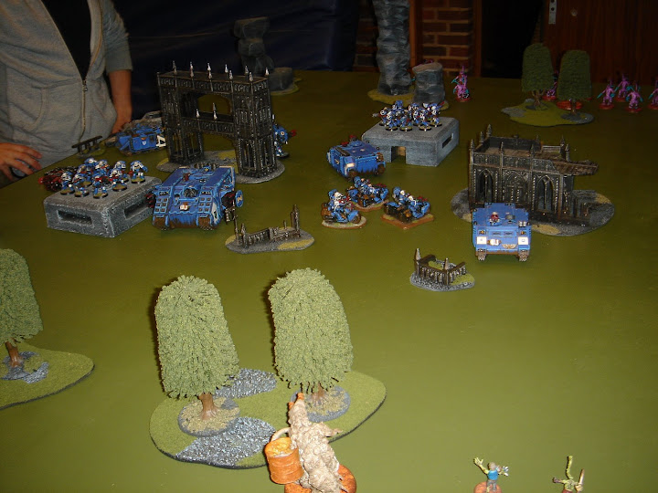 Læg mærke til Karanak's hound unit som har låst EFA's dread ude på hans venstre flanke, terminators brugte et par ture på at hoppe ud og tæve en plague bearer unit jeg deepstrikede ned i skoven lige bag dreaden.