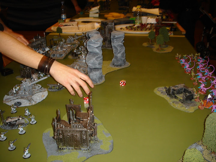 Bloodletteres deepstrikede ned mellem basilisk og bygning, 2 overlevede efterfølgende shooting phase, og charger et HW team og primaris psyker - men som det meget ofte er tilfældet når daemons charger ind i terræn, bliver de hugget ned før de kan slå igen, da det kun er meget få daemon units, der har adgang til granater.