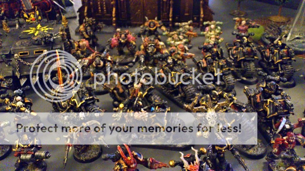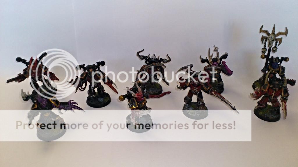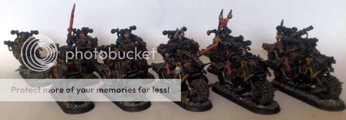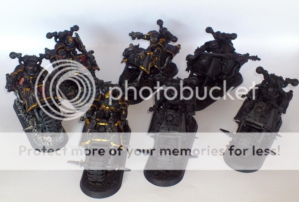 Alle 10 Bikers + en Lord(t) med kæmpe sværd, dvs 7 ny malede og 4 ældre som samtidig fik et touch up. En enhed jeg er ok glad for at spille med, da den har fået en ok pris, og har dejlig med bevægelighed. Det kripler dog i fingerne for at male dem som Night Lords, men har lidt mere Chaos der lige mangler og en spand fuld Necrons. Og tør ikke gå igang med dem, for at bange for at strande halvvejs, og så ikke have en helt malet hær. Så det må vente. Derfor har de heller ikke fået skulder symboler.