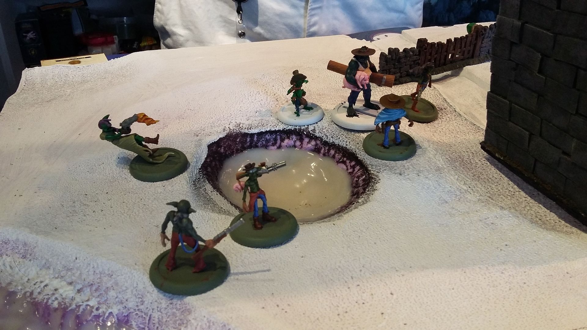 Til dagens 4 mands Malifaux sjov, kastede jeg hurtigt noget hvidt maling og blå filt på isbordet: